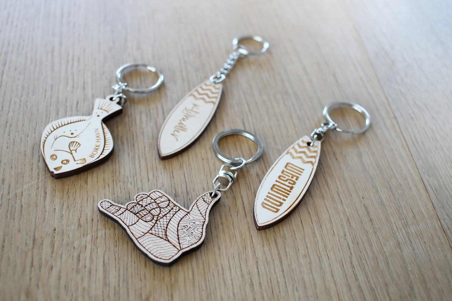Vi tilbyder nøgleringe i træ eller krydsfinér med dobbeltsidet design i farve og gravering. Vi er altid klar til at producere specialfremstillede nøgleringe med dit logo, tekst eller bynavn.